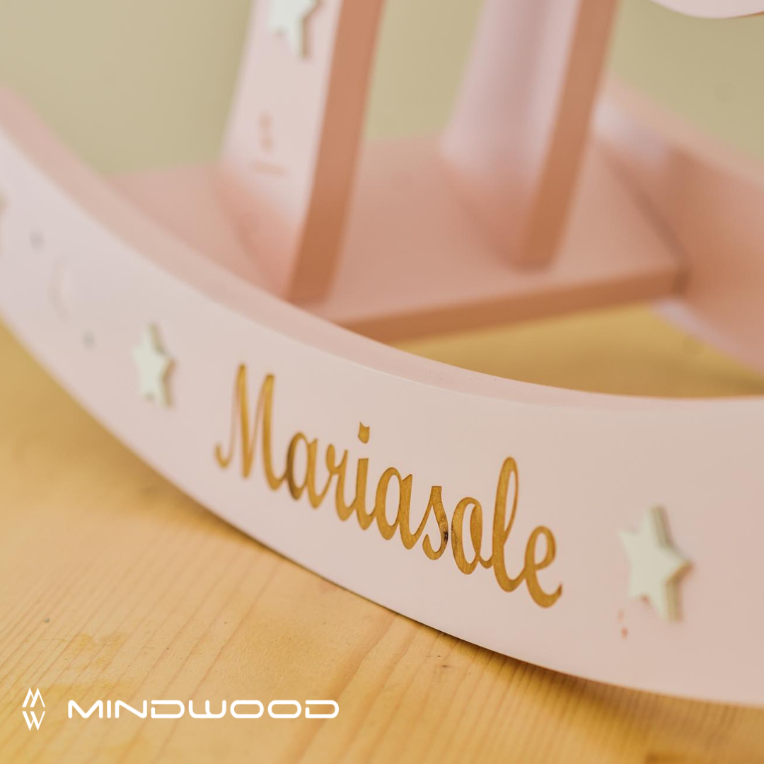 I nostri Dondoli in Legno sono una celebrazione del mondo incantato dell'infanzia, e li personalizziamo con il nome del tuo bambino per renderli unici e speciali.